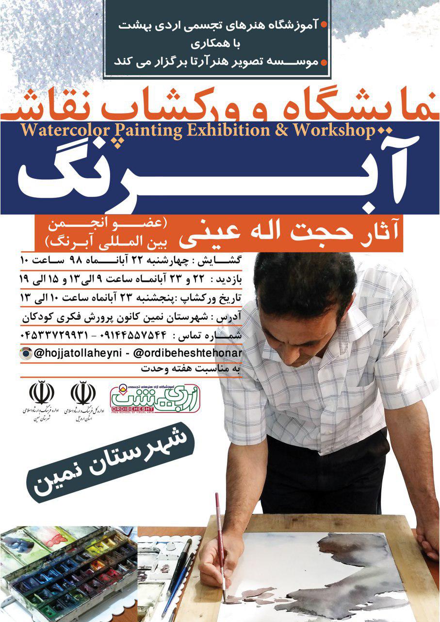 ورکشاپ و نمایشگاه آبرنگ در شهرستان نمین | به گزارش انجمن هنرهای تجسمی استان اردبیل ورکشاپ و نمایشگاه نقاشی آبرنگ حجتاله عینی روز چهارشنبه ۲۲ آبان ۱۳۹۸ در شهرستان نمین برپا خواهد شد.